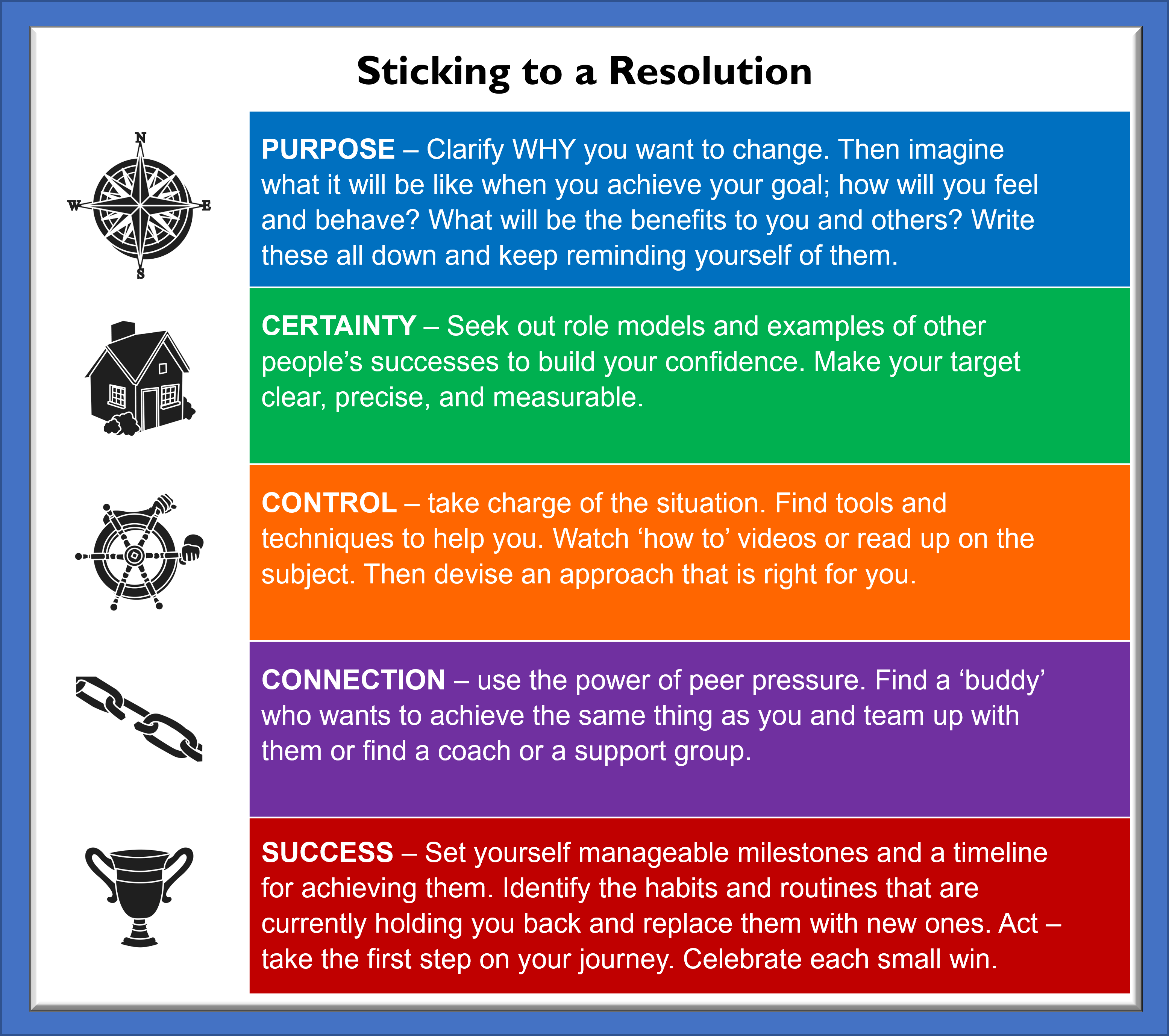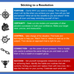 - PURPOSE – Clarify WHY you want to change. Then imagine what it will be like when you achieve your goal; how will you feel and