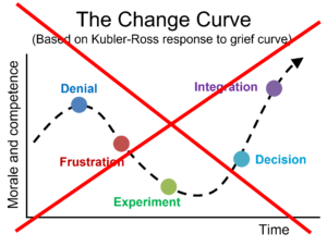 Firstly, it is based on Elizabeth Kubler-Ross’s research into people’s emotional reactions to impending death rather than on organisation change. Even in its proper context (people nearing end of life) it does not represent a linear journey as, in practice, people move back and forth between emotions.