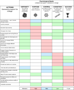 The process of helping people let go of old ways of working and embrace new ones does not require a PhD in psychology. There are several straightforward and effective tools that can be used facilitate the process as listed in the table called ‘Actions Generating Support for Change’.